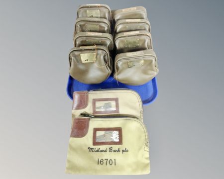 A tray containing vintage banking bags including eight leather bags with chub locks and keys, two Midland bank bags US version and keys.