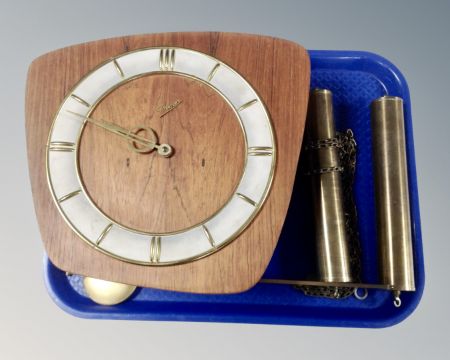 A continental teak wall clock with a pair of brass weights and pendulum.