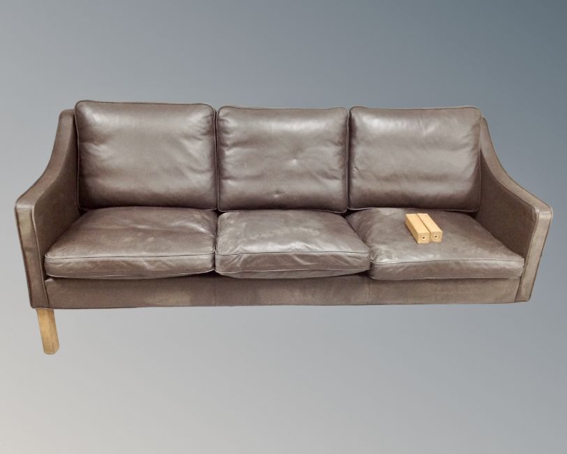 A 20th century Danish Hurup brown leather three seater settee (three legs currently loose)