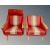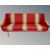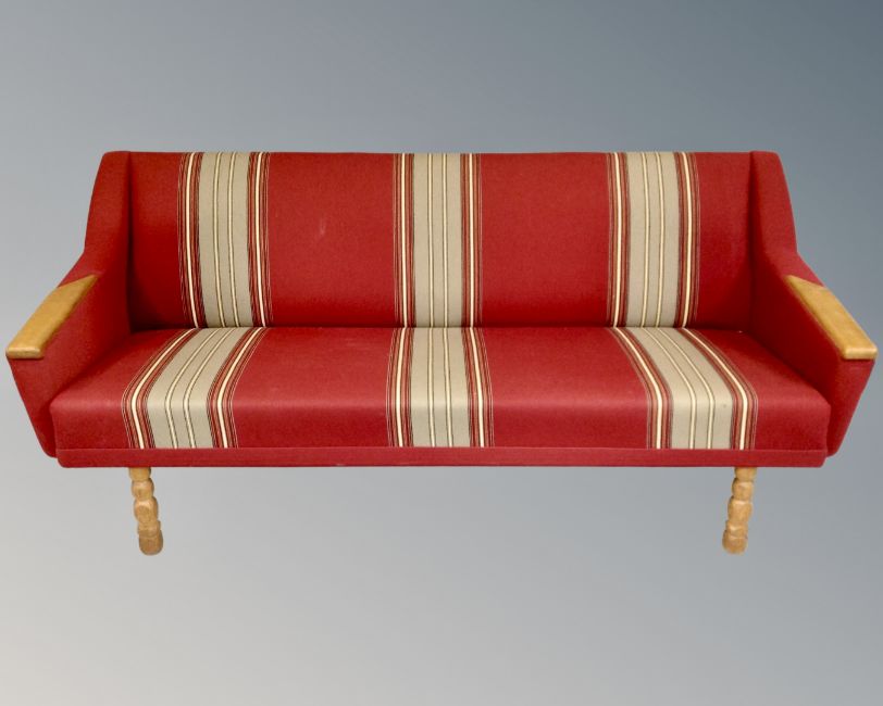 A three piece Danish 20th century lounge suite in red striped fabric with oak arms and legs