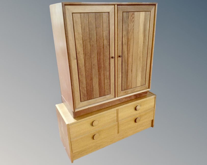 A teak effect double door cabinet together with a four drawer low chest.