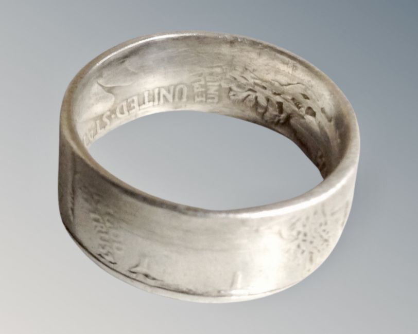 A gent's silver ring made from an American half dollar coin.