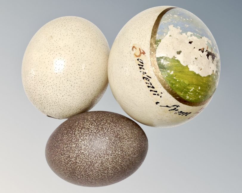 Three ostrich eggs, one painted.