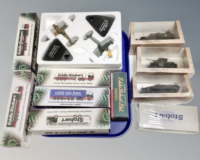 A collection of Eddie Stobart die cast haulage vehicles, Atlas Edition military trucks, Battle of Britain Spitfire etc.