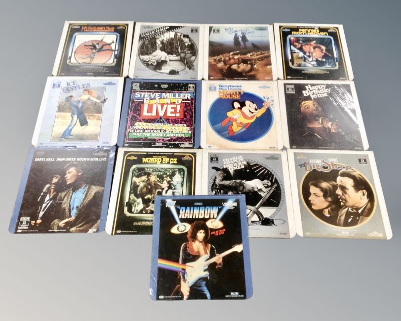 A collection of 13 vintage video discs including The Wizard of Oz, Charlie Chaplin in City Lights, Steve Miller band etc.