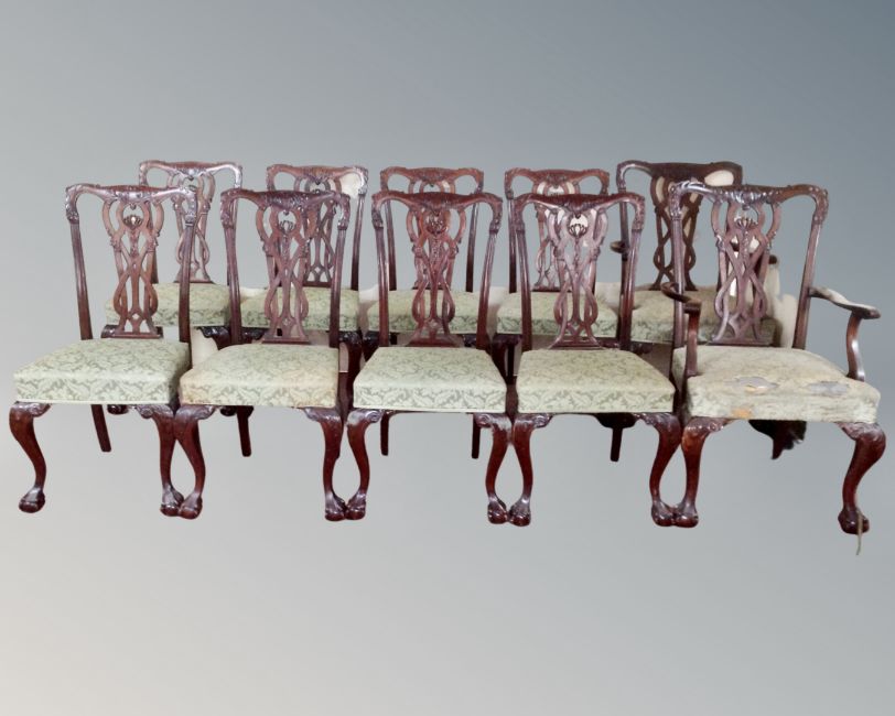 Ten early 20th century century mahogany Hepplewhite style dining chairs on claw and ball feet