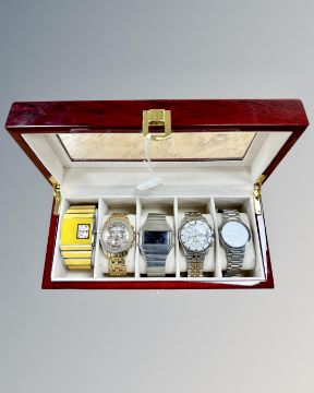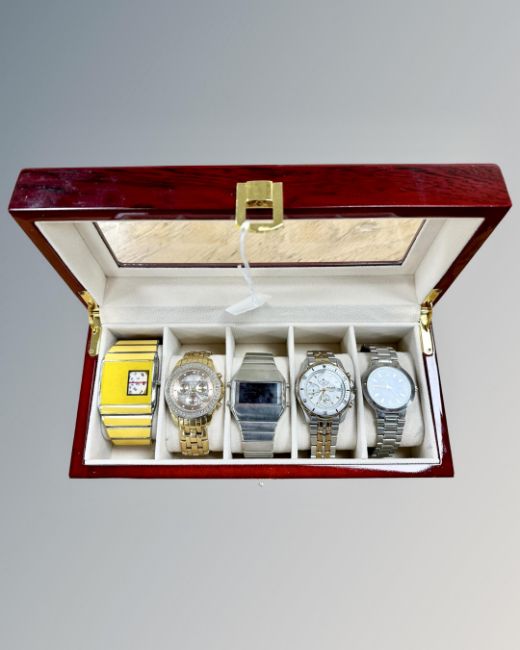 A modern watch box containing five gent's watches comprising Ben Sherman, Pulsar, Softech (X2) and Diamond & Co.