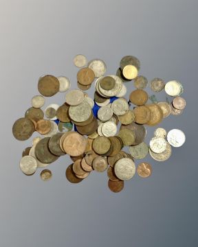 A box containing antique and later British and foreign coins including cartwheel penny.