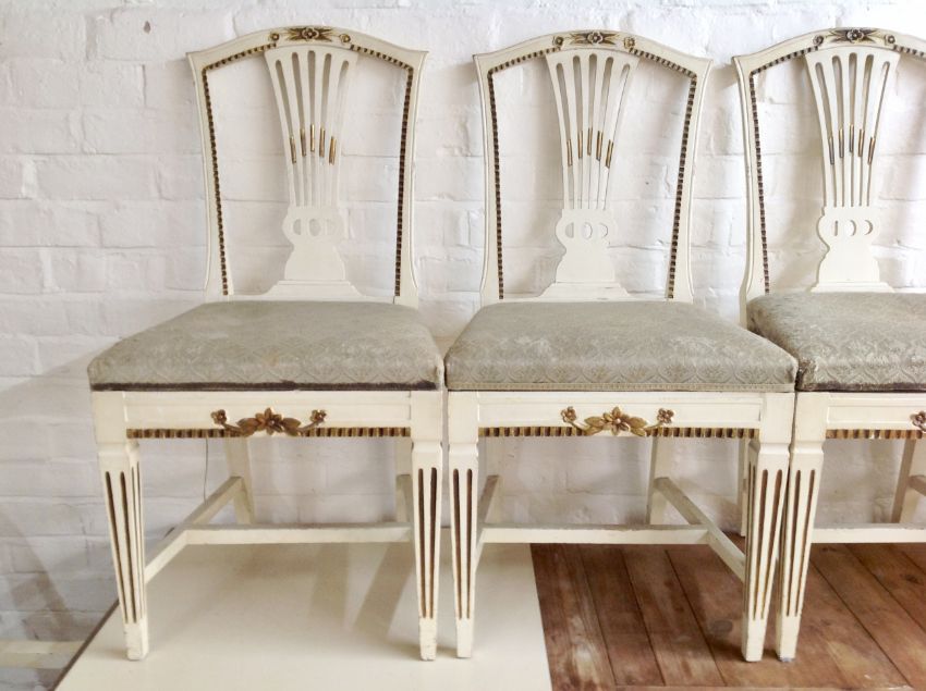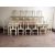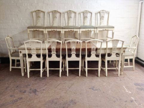 A 20th century continental white and gilt painted extending dining table, with two un-finished leaves, and twelve matching dining chairs