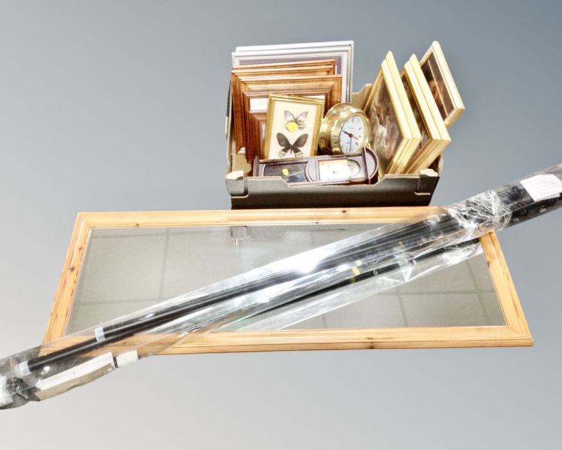 A contemporary pine rectangular mirror together with a boxed curtain pole and a box containing pictures and prints, framed butterfly specimens, contemporary wall clocks etc.