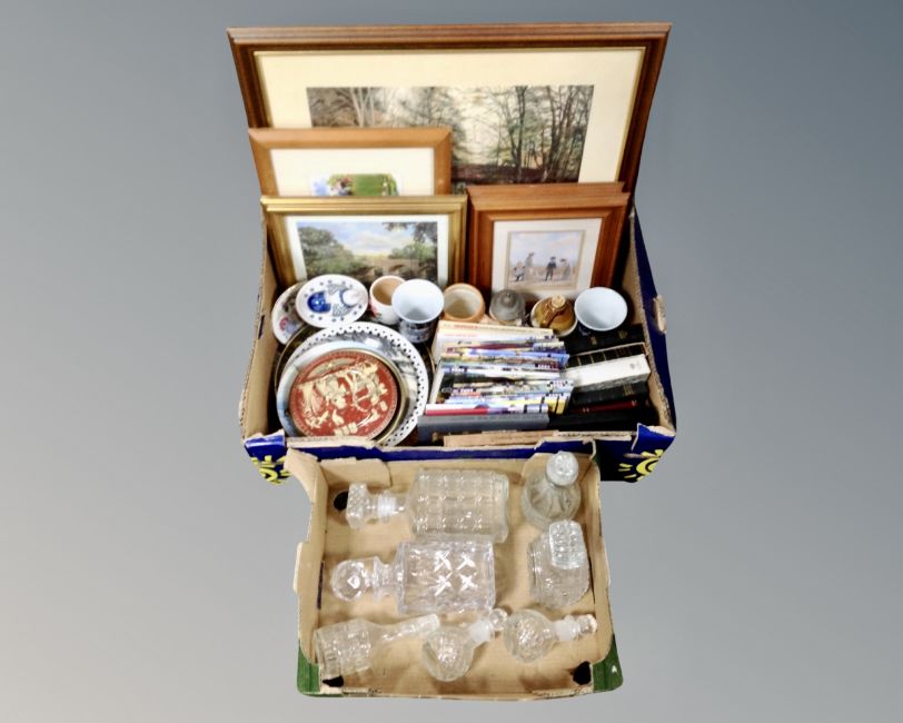 Two boxes containing decanters, Holy bible, further booklets, ceramic plates, pictures and prints