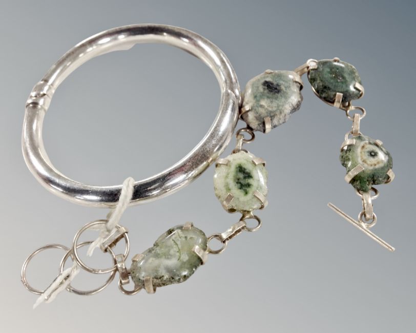 A hollow hinged 925 silver bracelet and a bracelet of polished agate stones in silver mounts