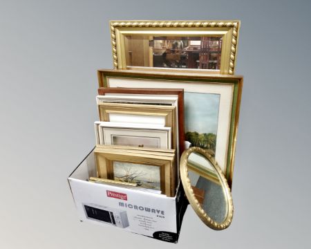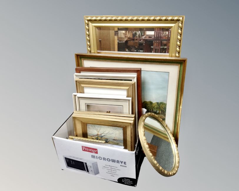 Two gilt framed mirrors together with a collection of assorted pictures, prints, tapestry etc.