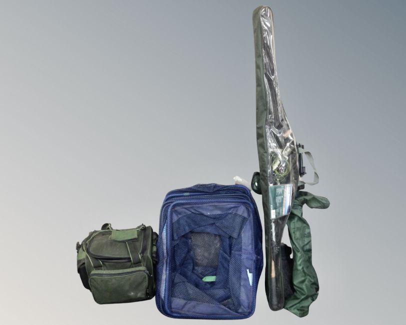 A Multi-X fishing rod and reel in carry bag together with a fishing bag, rod stand and two landing nets.