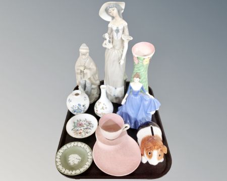 A tray containing Maling cup and saucer, Leonardo collection figure, Spanish ornament etc.