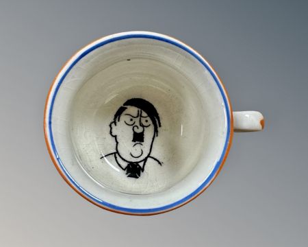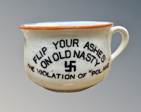 A small novelty Fieldings ash pot 'Flip your ashes on Old Nasty, The Violation of Poland', the interior with a caricature of Hitler