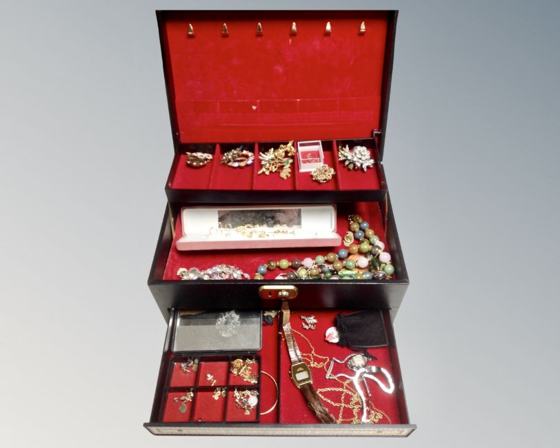 A contemporary lift out jewelry box contain costume beads, lady's wristwatches, earnings, broaches, etc