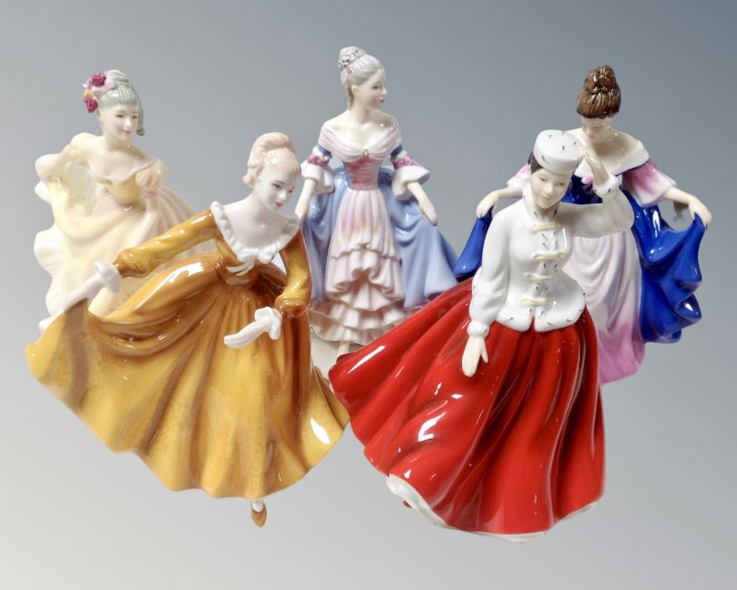 Five Royal Doulton Pretty Ladies figures, Ninette, Gail, Southern Belle, Kirsty and Sara.