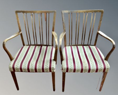 A pair of mid 20th century beech open armchairs with tapestry seats