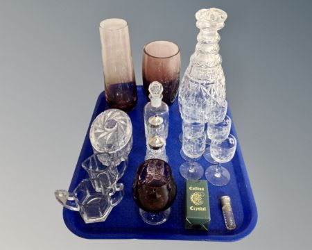 A tray containing cut glass decanter with stopper, set of six etched sherry glasses, sifters, trinket box etc.