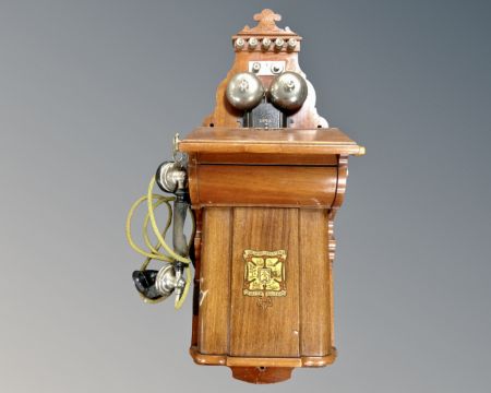 A continental mahogany bell wall telephone.