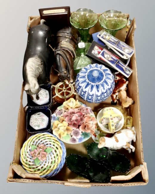 A box containing china shire horses, collector's spoons, coloured glass ware, ornaments etc.