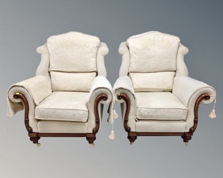 A pair of contemporary armchairs upholstered in cream classical fabric raised on brass castors