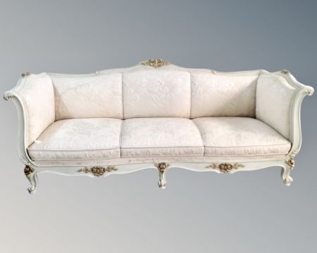 A 19th century style three seater settee with scatter cushions with gilded highlights