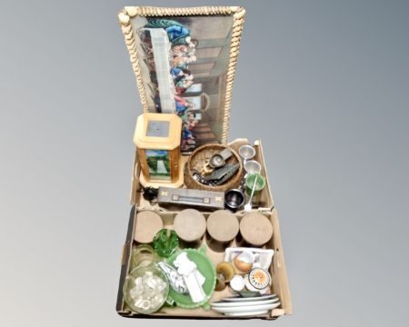 Two boxes of motion lamp, Denby storage jar, kitchenalia, religious picture etc