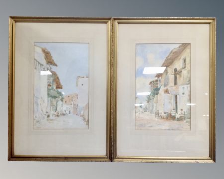 A pair of watercolours depicting figures in a rural village in gilt frames