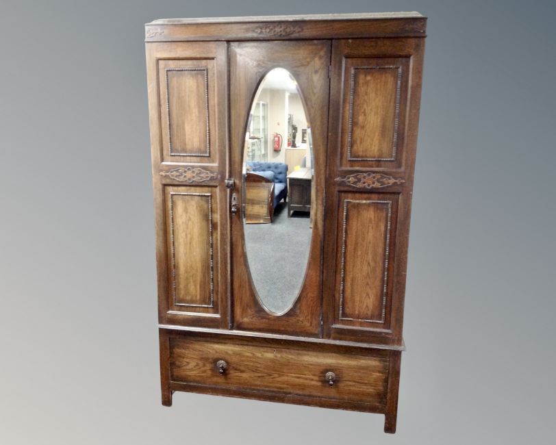 A three piece Edwardian oak bedroom suite comprising mirror door wardrobe, three-drawer dressing chest and further three-drawer chest