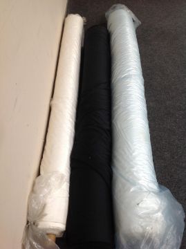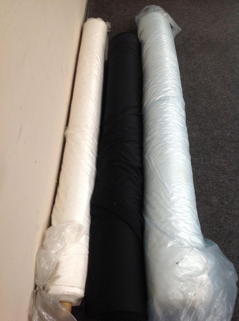 Six boxes of assorted fabric trim and three rolls of fabric