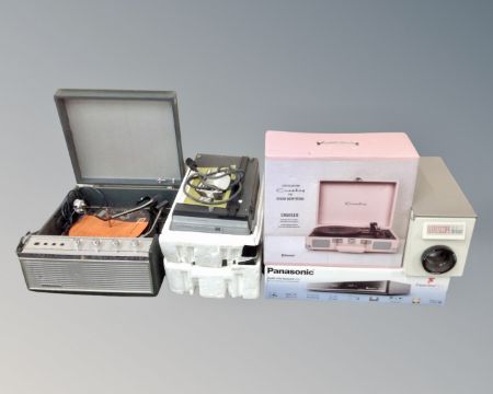A 20th century Ferguson electric record player with Garrard turn table, together with an Urban Outfitters Crossley record player, Panasonic blu-ray dvd player, Bolex eight cartridge projector, Elitescope de-luxe