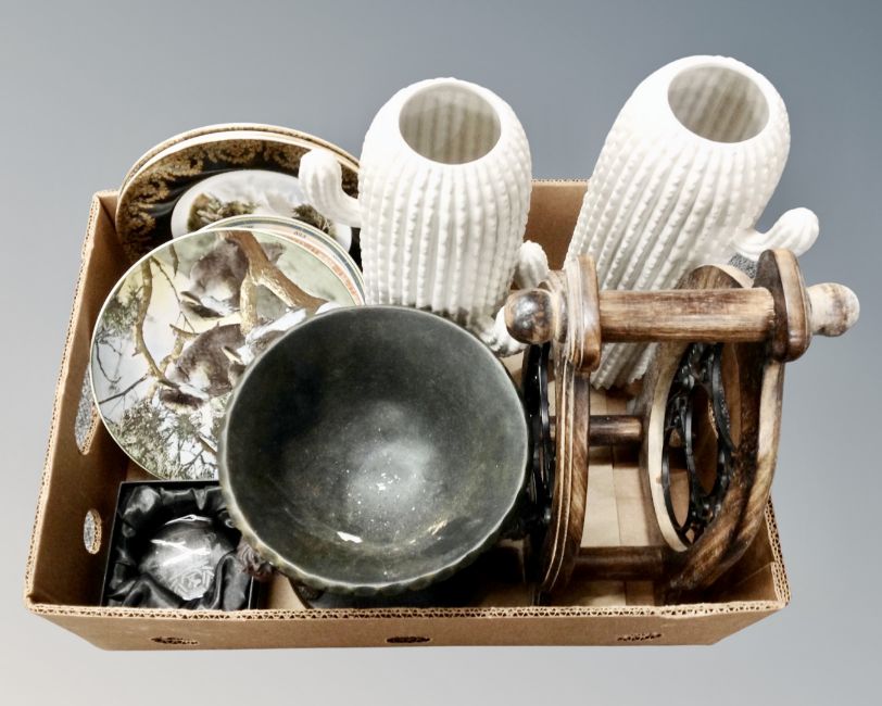 A box of pair of contemporary ceramic cactus vases, wine rack, cherub comport, assorted wall plates, Royal Doulton etc