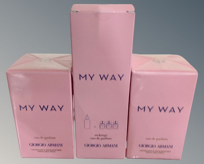 Two bottles of Giorgio Armani My Way eau de parfum, 90ml, boxed sealed, together with a further Giorgio Armani My Way Recharge eau de parfum, 150ml, boxed. (3)