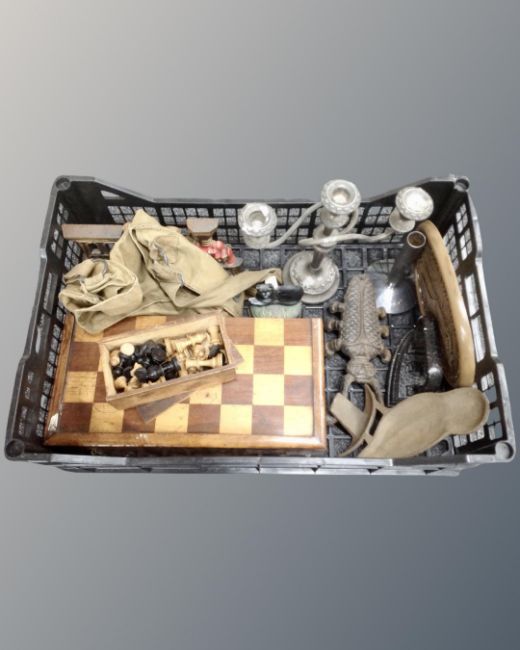 A crate containing a marquetry chess board, boxwood chess pieces, cast iron door stop, scarab beetle boot jack etc