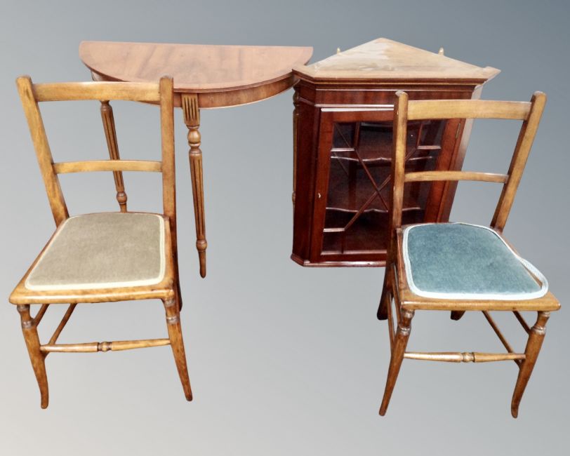 A pair of stained beech bedroom chairs together with a glazed door hanging corner cabinet and a D-shaped hall table.
