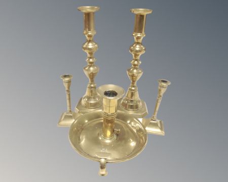 Two pairs of vintage brass candlesticks together with a further brass candlestick