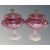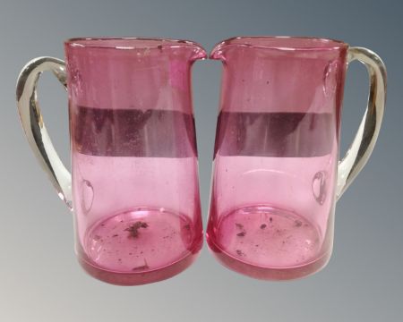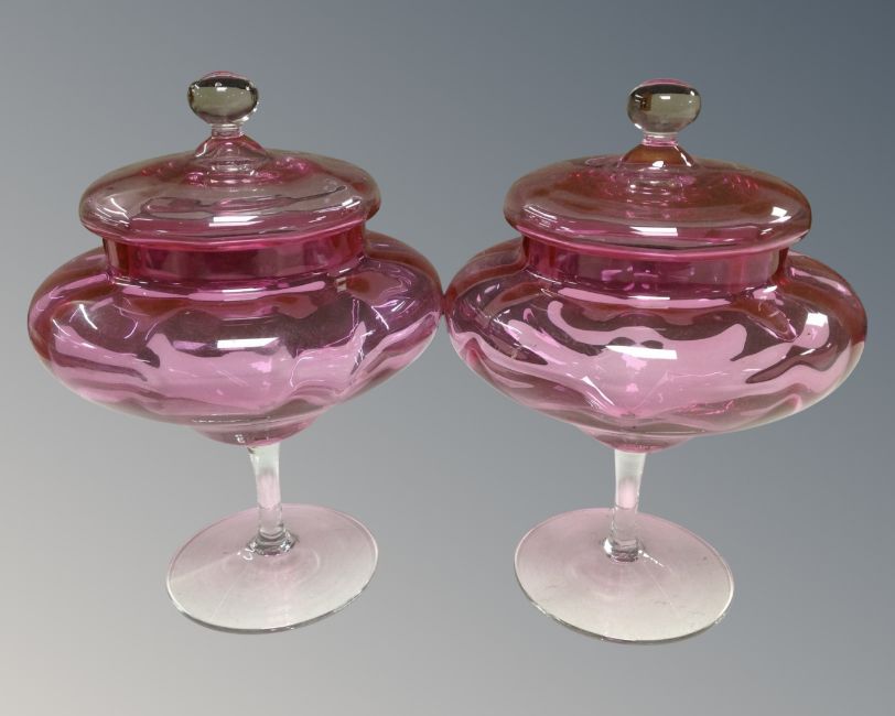 Two antique cranberry glass jugs together with a pair of lidded cranberry glass comports