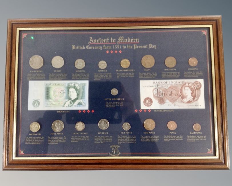 An ancient to modern British currency from 1551-present day coin montage in frame