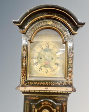 A Danish lacquered longcase clock with painted dial and Chinoiserie case, pendulum, no weights
