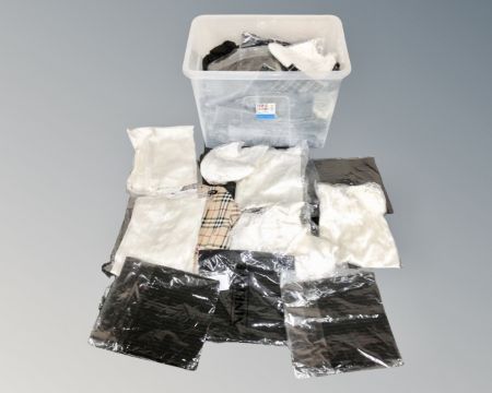 A box of lady's clothing, dresses, skirts, blouses, tagged as new.