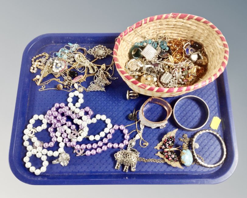 A basket of good quality costume jewellery including Indian turquoise pendant, bag of named pearls etc