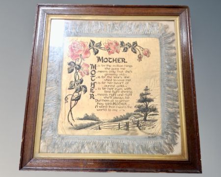 An early 20th century poem on silk 'Mother' in oak frame
