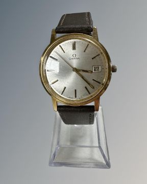 A gent's gold plated and stainless steel Omega centre seconds calendar wristwatch, inscription to case back, calibre 1030 manual wind wristwatch, case 35mm.