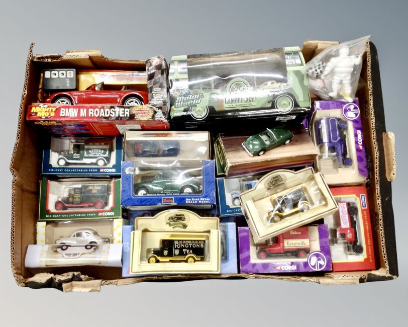 A box of die cast vehicles, Corgi, Ringtons tea, Dinky etc, all boxed.