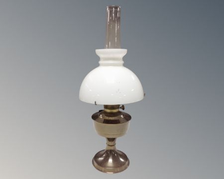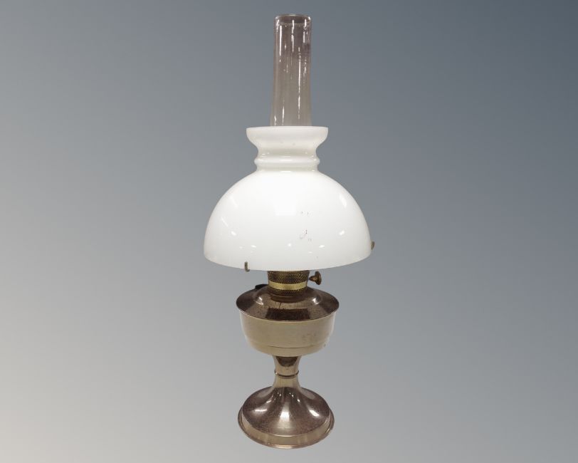 An Aladdin chrome oil lamp with chimney and shade