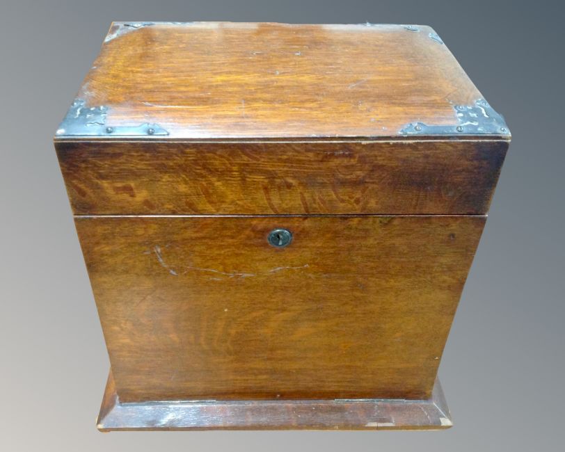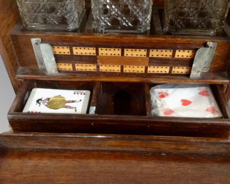 A 19th century fitted decanter box containing three cut glass decanters, bridge board and playing cards