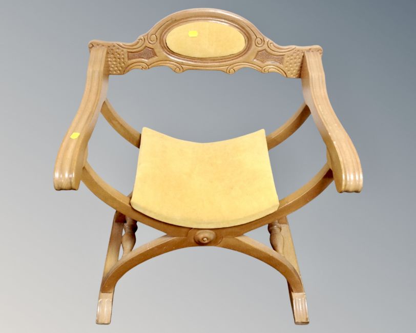 A carved beech wood Savonarola armchair