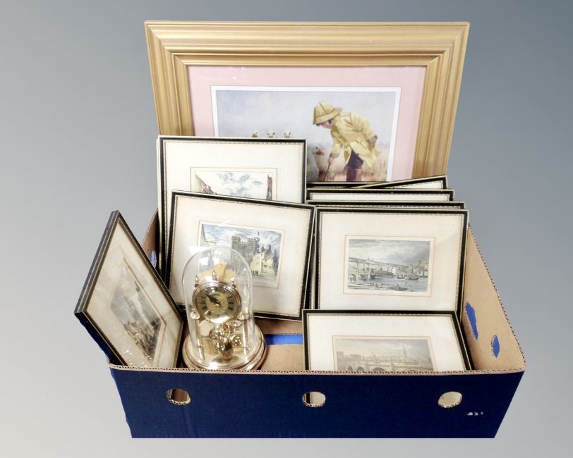 A box of assorted pictures including antique coloured engravings of Newcastle, clock under shade